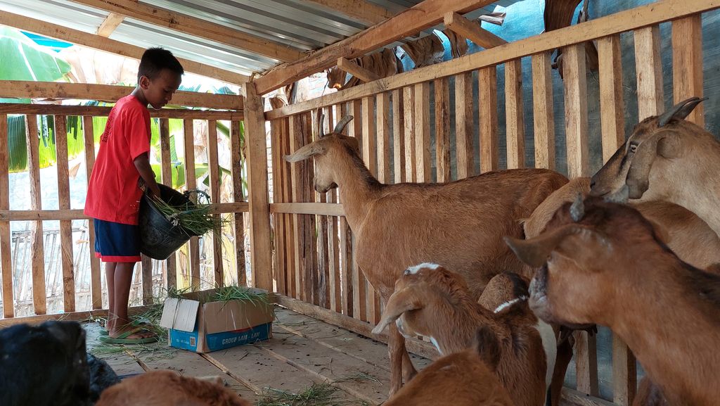 "Memang sehabis pulang sekolah, kesehariannya mengambil rumput dan kasih makan kambing," kata Rahma, relawan berbuatbaik.id yang mendampingi Muhammad sehari-hari.