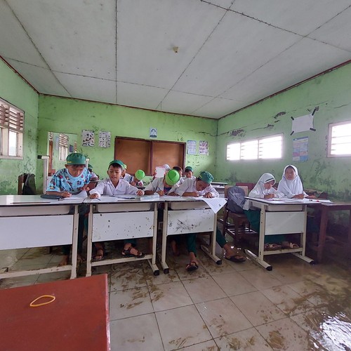 Sekolah Nuraini di Kampung Beting Jaya pun tak kalah menyedihkan karena banyak buku pelajaran terendam air dan hanya dua ruangan kelas yang bisa digunakan karena kelas lainnya nyaris roboh.