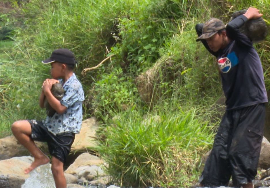Setiap hari Ibu Enung (47) dan dua anak laki-lakinya menyusuri sungai mencari bongkahan batu di tengah derasnya sungai. Selain berat mengangkut batuan, terkadang beberapa orang merasa terganggu dan mengusir secara halus Ibu Enung dan anaknya.