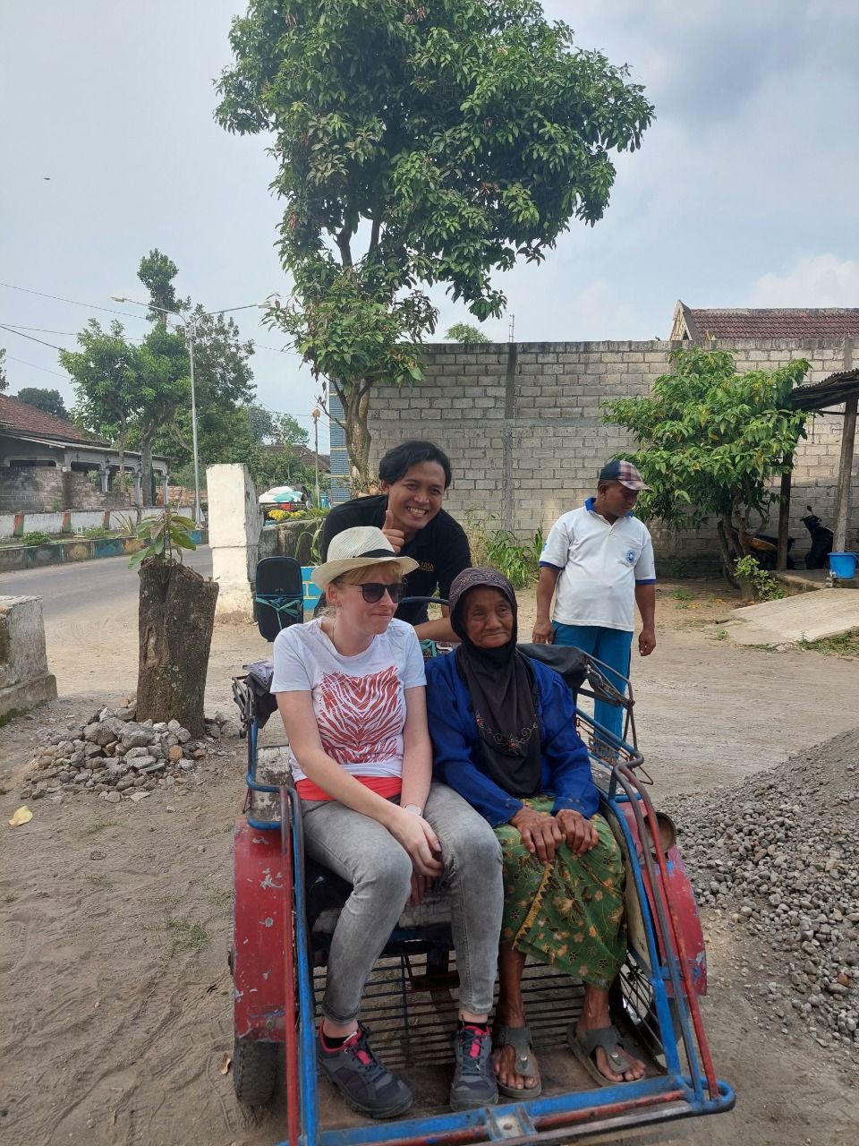 Dalam penyaluran donasi kali ini, Mbah Satinem ditemani juga oleh Imke Bouten yang merupakan warga negara Belanda. Bagi Imke ini adalah pengalaman baru untuknya berkendara motor sekaligus berbagi cerita bersama Mbah Satinem. Begitu pun Mbah Satinem yang baru pertama kali bertemu bule, begitu bahagia mengobrol dengan Imke. Meskipun ada kendala bahasa keduanya bisa berbagi tawa. Apalagi Imke dan Mbah Satinem bersama-sama berkeliling dengan bentor, kendaraan yang sering dipakai Mbah untuk berjualan jeruk.