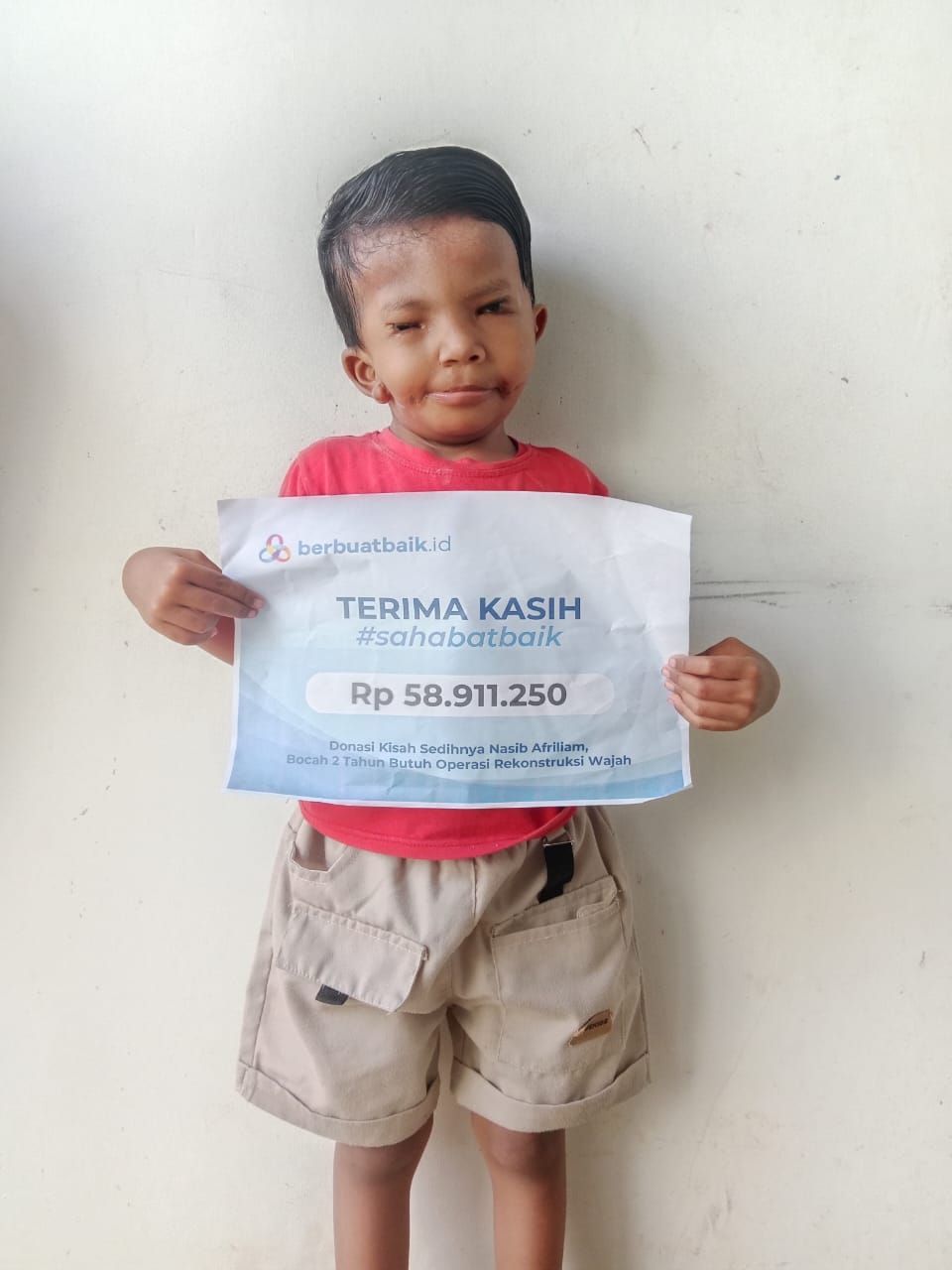 Terima kasih #SahabatBaik atas doa dan uluran tangan yang telah diberikan. Donasi senilai Rp 58.911.250 telah membawa harapan baru bagi keluarga Afriliam, yang terus berjuang untuk buah hati. Yuk, terus sebarkan kebaikan dengan berdonasi di berbuatbaik.id, 100% donasimu tersalurkan langsung kepada yang membutuhkan!