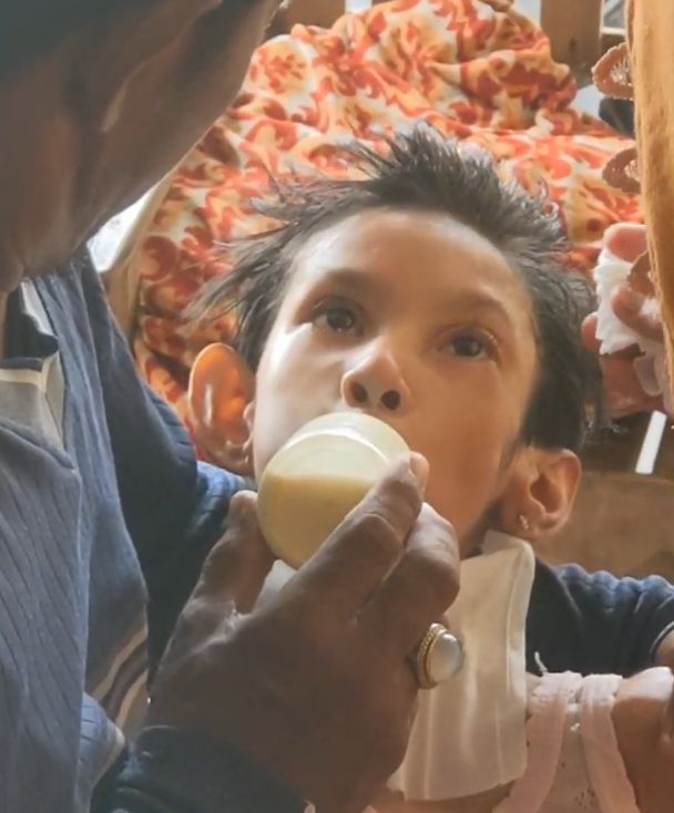 "Pas dilepas selang mulutnya awalnya rapet, dikit-dikit dikasih minyak akhirnya mulut bisa kebuka Alhamdulillah. Kondisi sekarang Dede sih agak mending menurut saya sih dibanding sebelumnya. Sekarang telinga sudah denger. Tajin itu kan sari beras semacam kalau kita ga makan seperti makan, jadi dikasih itu terus dan sekarang dikasih bubur. Makan itu terus gizi kurang. Sekarang udah bubur dan susu juga sekarang lewat mulut. Mudah-mudahan sembuh secara perlahan. Biaya rumah sakit itu jutaan. Ganti selang aja waktu itu 1 juta lebih tiga hari sekali," cerita Turinih panjang lebar.