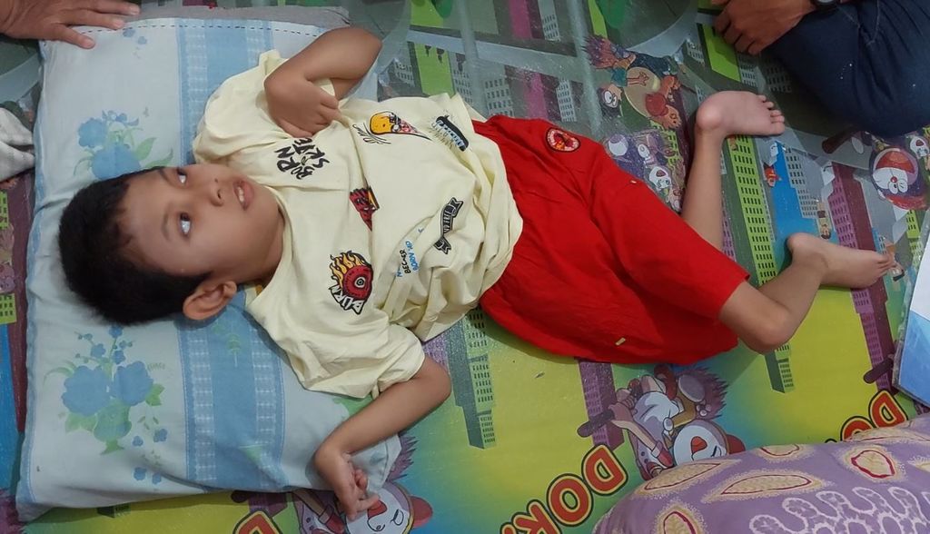 Sorot mata Alvino Naufal Nurhakim (10) terlihat penasaran saat tim berbuatbaik.id mengunjungi kediamannya di kawasan Jatinegara, Jakarta Timur. Alvino hanya berbaring dan terlihat segar sehabis mandi. Walau hanya tergeletak seperti penderita cerebral palsy pada umumnya, namun Alvino terlihat bersemangat bahkan diketahui mulai berpuasa.