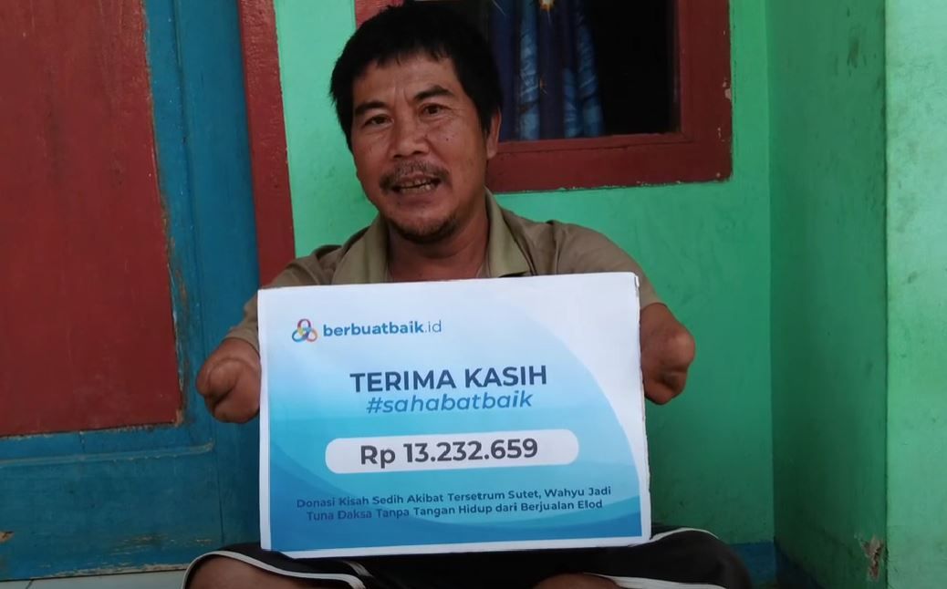 "Saat itu lagi kerja bangunan. Waktu itu saya di atas di lantai 2 kan, jadi saya di belakang mau pindah ke tengah sedangkan sutet masih di depan ada 12 m jaraknya mau pindah ke tengah, nggak inget, inget-inget udah kesetrum di atas udah kesengat listrik. Nggak tahu ketarik nggak tahu gimana, tapi kata orang mah seperti terbang. Lalu 1 bulan harus diamputasi karena sudah busuk, tangannya sesudah dibedah, dua-duanya diamputasi," cerita Wahyu kepada tim berbuatbaik.id.