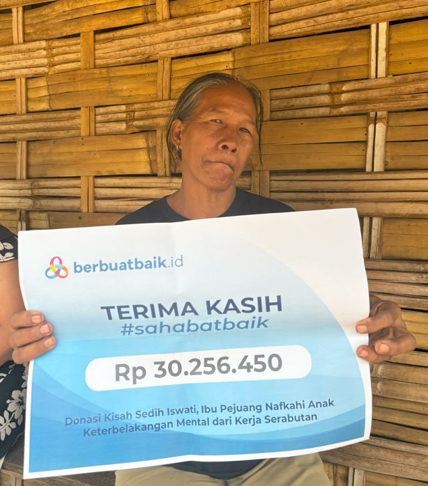 Ibu Iswati, ibu tunggal yang bekerja keras untuk menghidupi anak bungsunya berketerbelakangan mental kini mendapatkan kebahagiaan yang luar biasa dari Sahabat Baik. Ibu Iswati sudah membeli beberapa kebutuhan untuk mewujudkan renovasi rumahnya yang masih berlantai tanah dan tidak memiliki kamar mandi.
