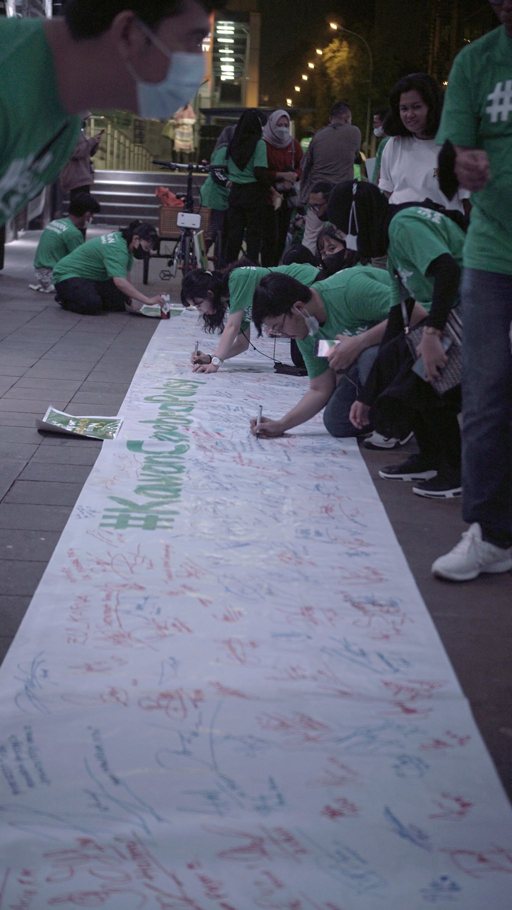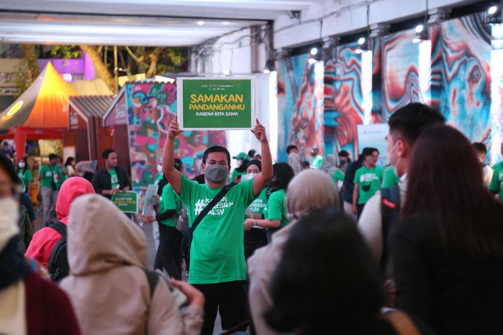 Di tengah kelap kelip lampu terowongan estestik ini, Founder Jendela Cerebral Palsy yaitu Aisyah Cahyu Cintya, teman-teman cerebral palsy serta para relawan bersama-sama mengajak masyarakat yang tengah berlalu lalang di Sudirman untuk bersama-sama mendukung gerakan #samakanpandanganmu sekaligus membubuhkan tanda tangan di kanvas putih.