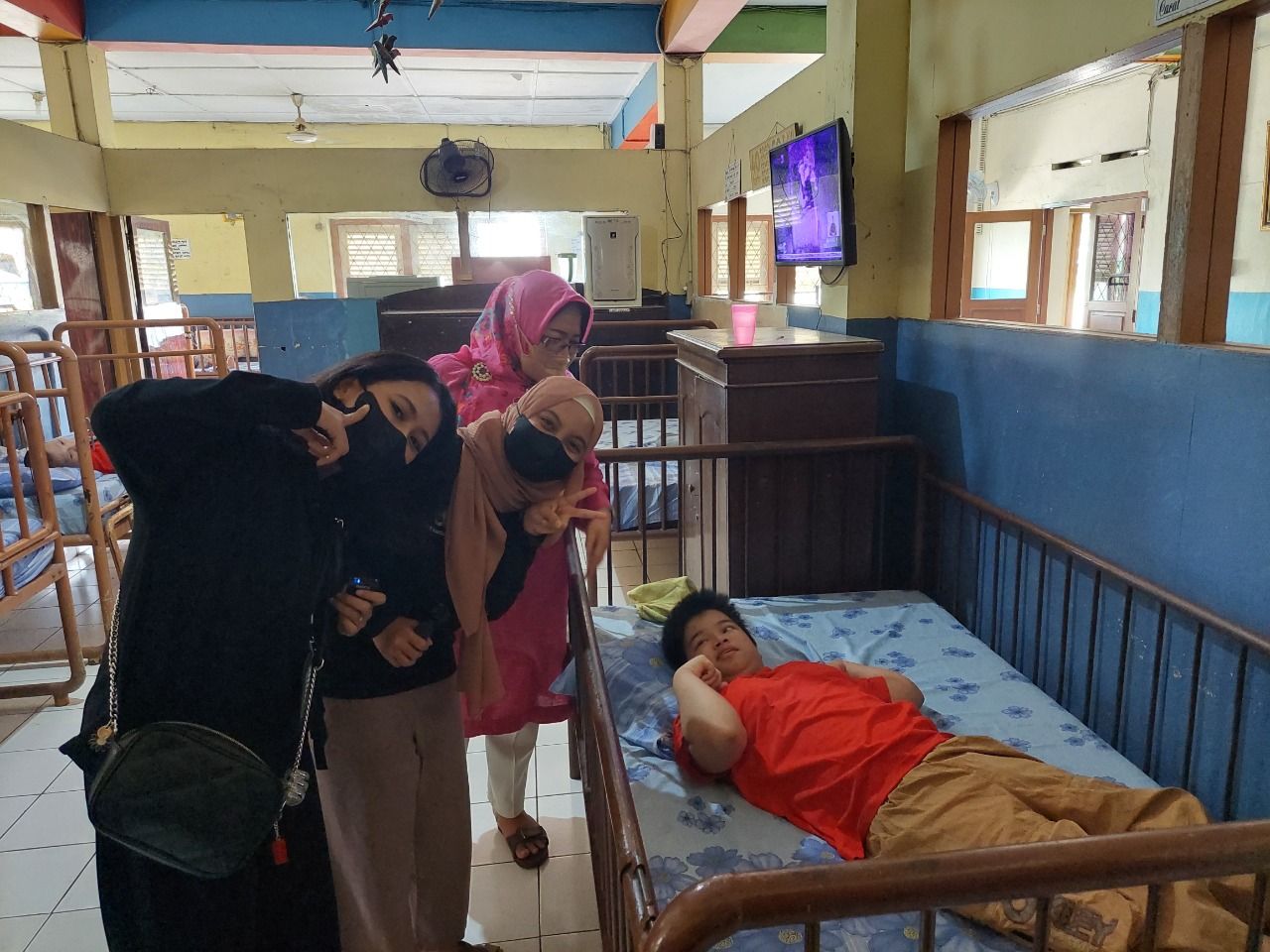 Kristanti selalu pengelola Wisma, menyambut kedatangan kami sekaligus membawa kami ke bangsal-bangsal tempat mereka berada. Tim juga menyapa dan berkenalan dengan anak-anak tersebut. Ica salah satunya, yang saat kami datang dia sedikit uring-uringan karena berkeras mau menonton televisi padahal waktunya tidur siang.