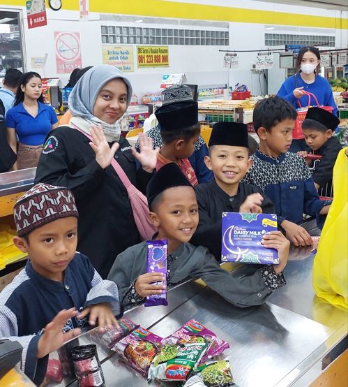 Dalam waktu singkat, keranjang dan troli mereka sudah penuh dengan cokelat, snack, roti hingga perlengkapan mandi. Mata mereka berbinar seakan begitu bahagia akan kesempatan yang diberikan.